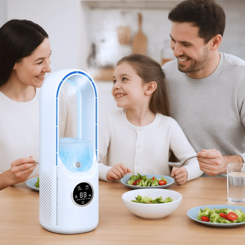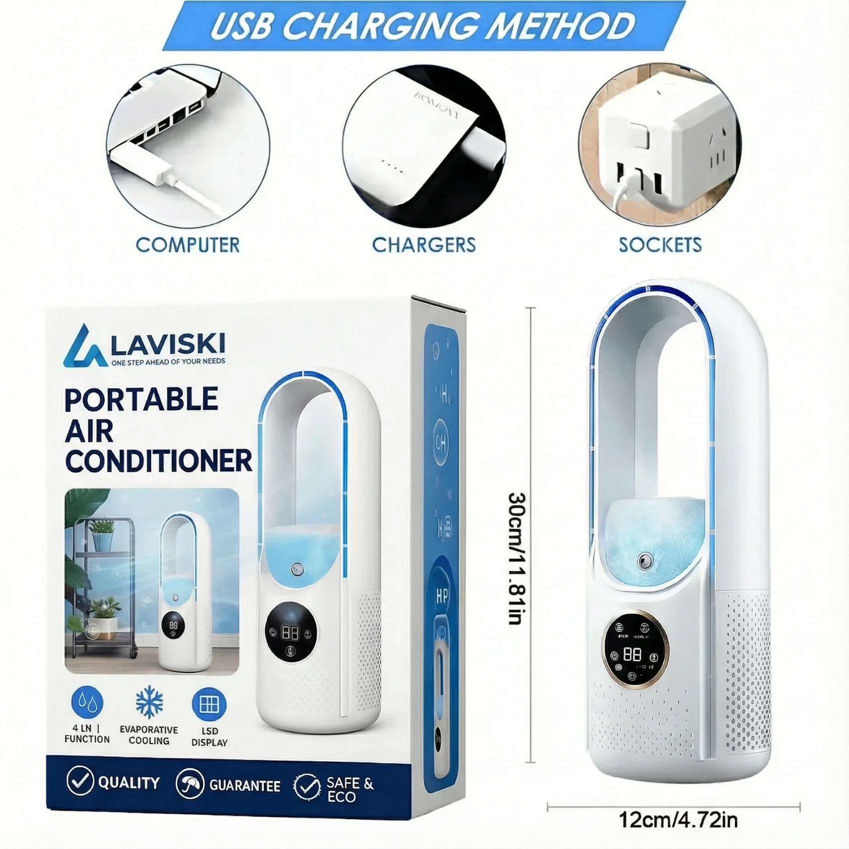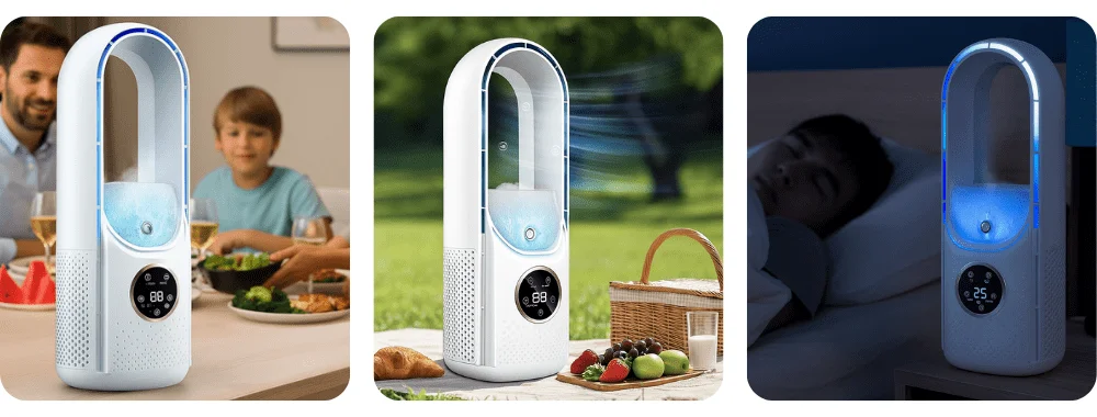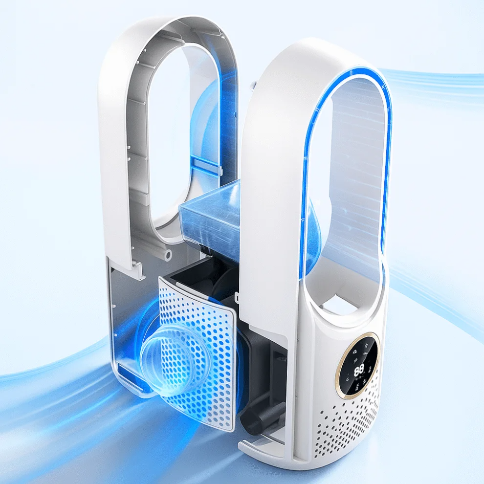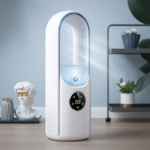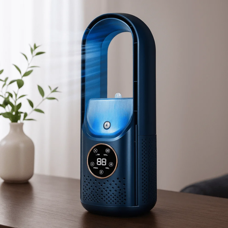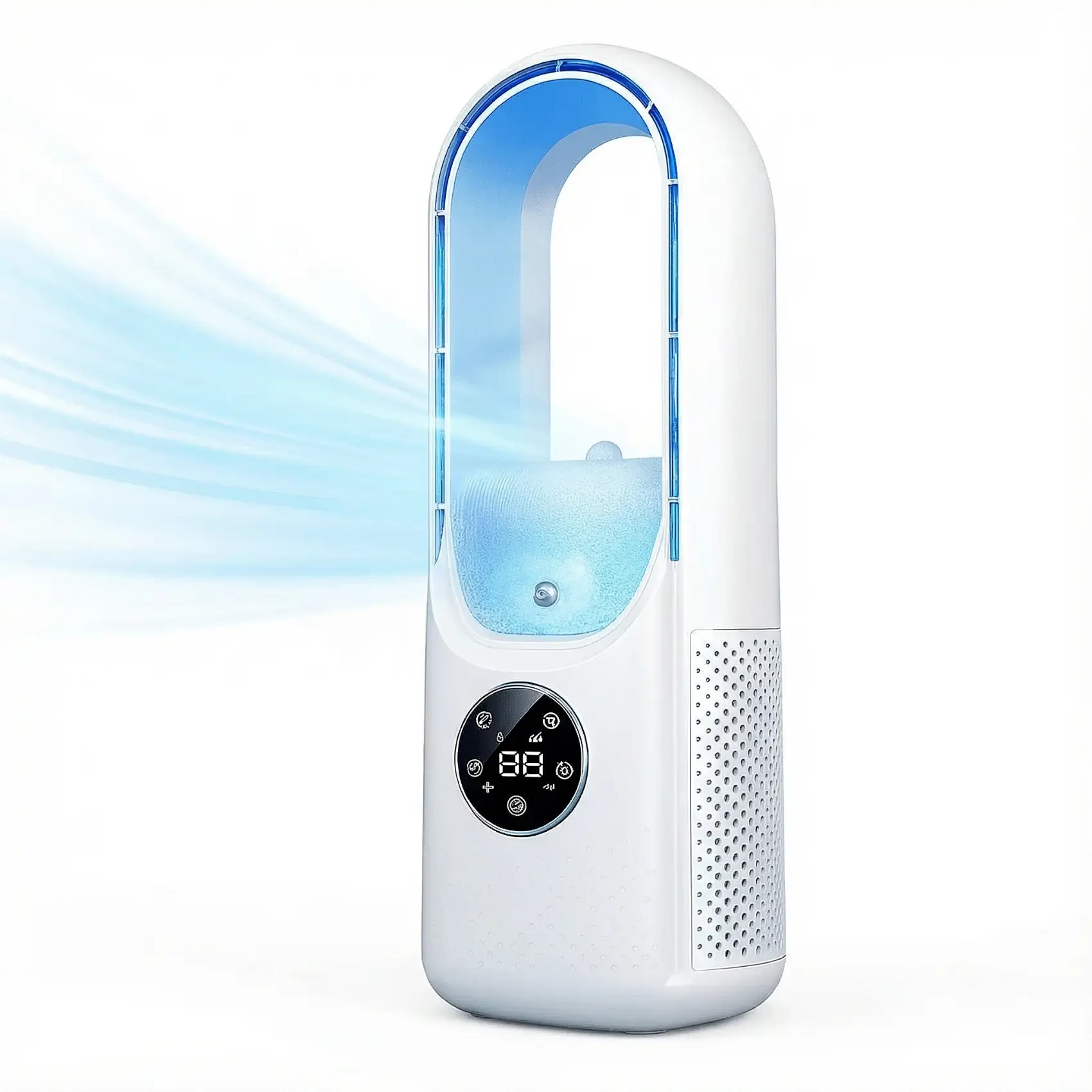The compact lightweight design with built-in handle moves easily between rooms or packs into travel bags. 100ml water tank adds refreshing moisture to air while cooling. Energy-efficient motor uses minimal electricity compared to traditional fans, saving money on utility bills. The sleek tower design fits neatly on desks, nightstands, or countertops without taking valuable space. Durable ABS and aluminum construction withstands daily use.