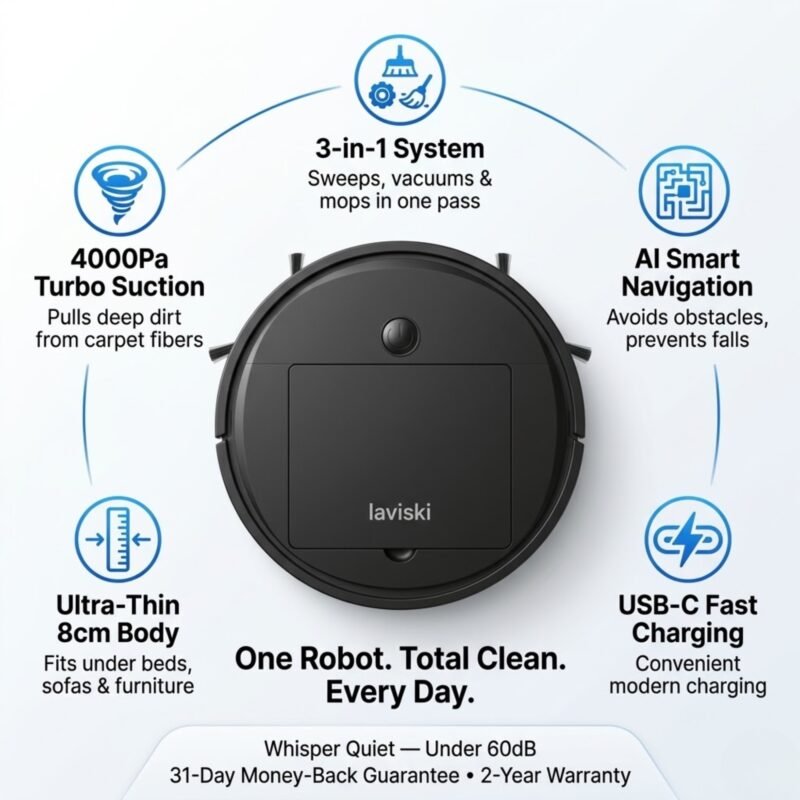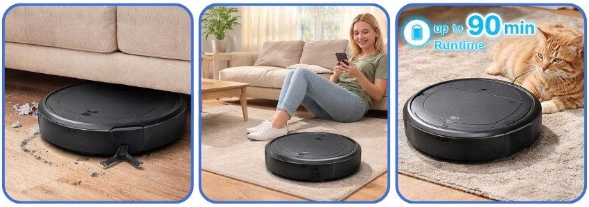 - 3-in-1 System: Sweeps, vacuums, and mops in one pass for efficiency.