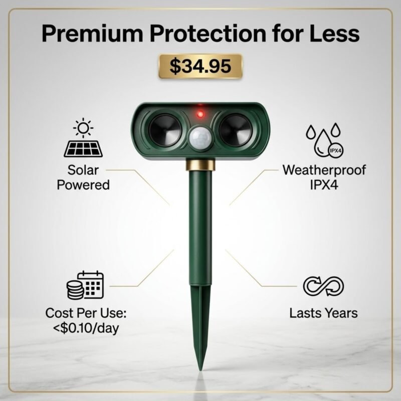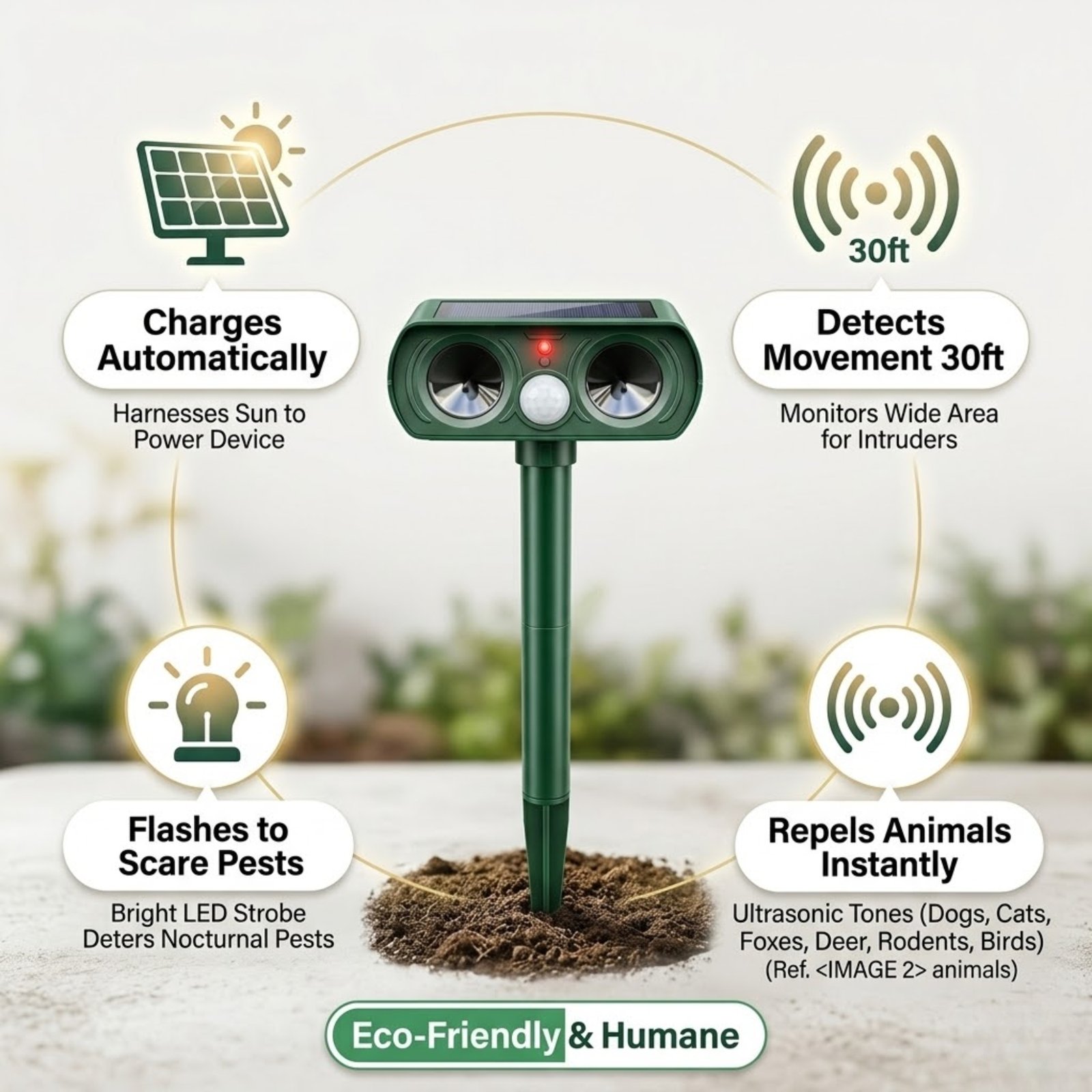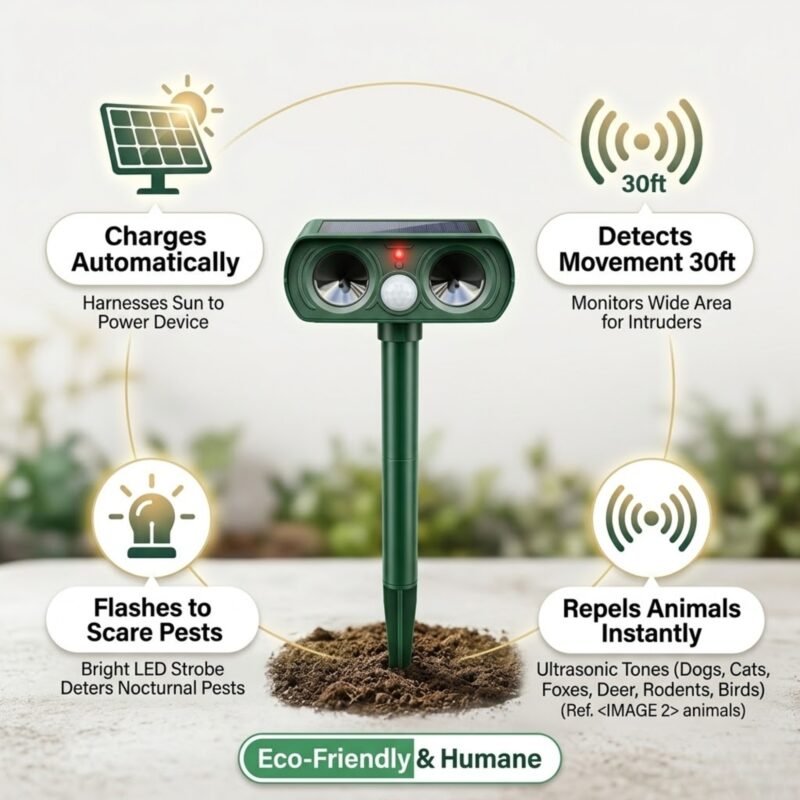 - Humane Deterrent: Uses sound and light rather than harmful chemicals or traps to protect wildlife.