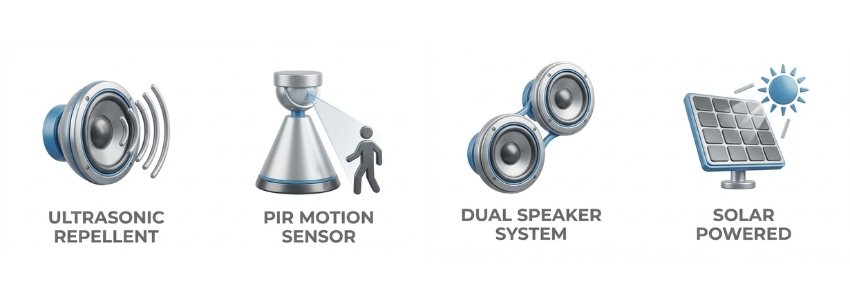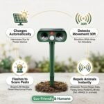 - Features & Performance: 110-degree PIR sensor, Adjustable Ultrasonic Frequency, Solar Panel, Flashing LEDs.