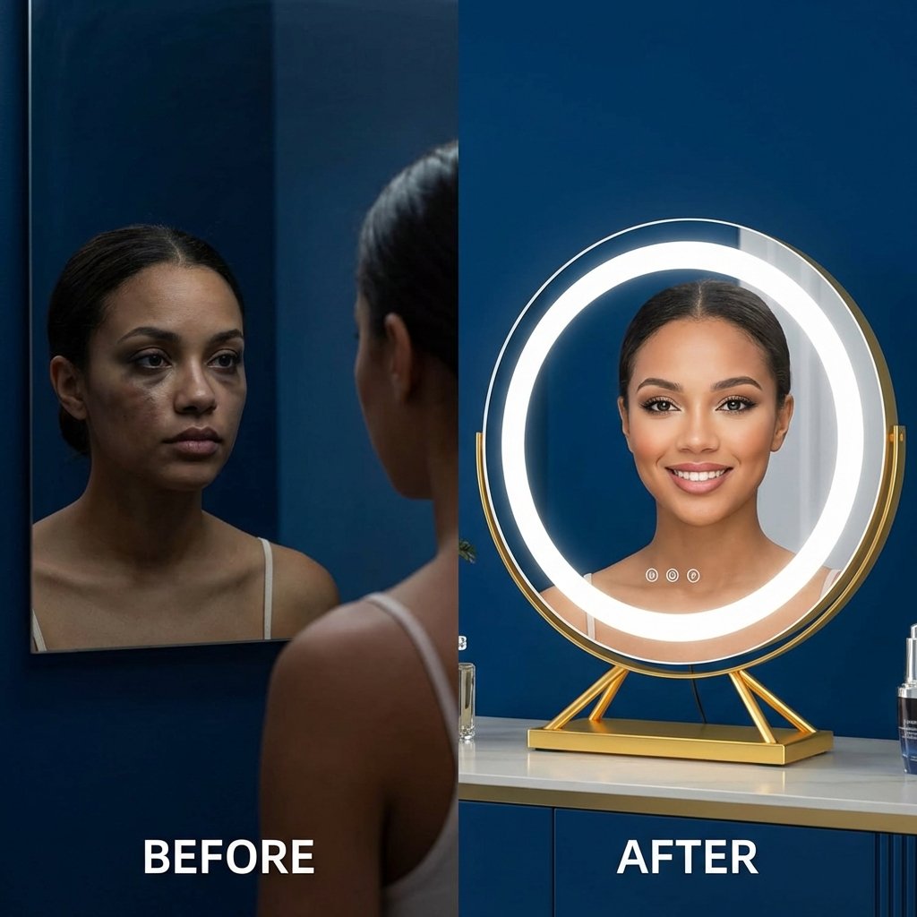 Achieve professional-grade results at home with the LED-Glow vanity mirror. Featuring three adjustable light modes (Warm, Daylight, Cool) and a smart touch-sensor dimmer, this mirror ensures your makeup is always flawless. The 360-degree rotation and sleek gold iron frame offer both style and function, making it the perfect centerpiece for your modern dressing table.