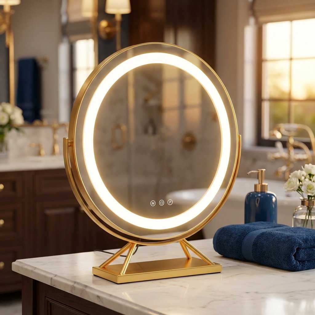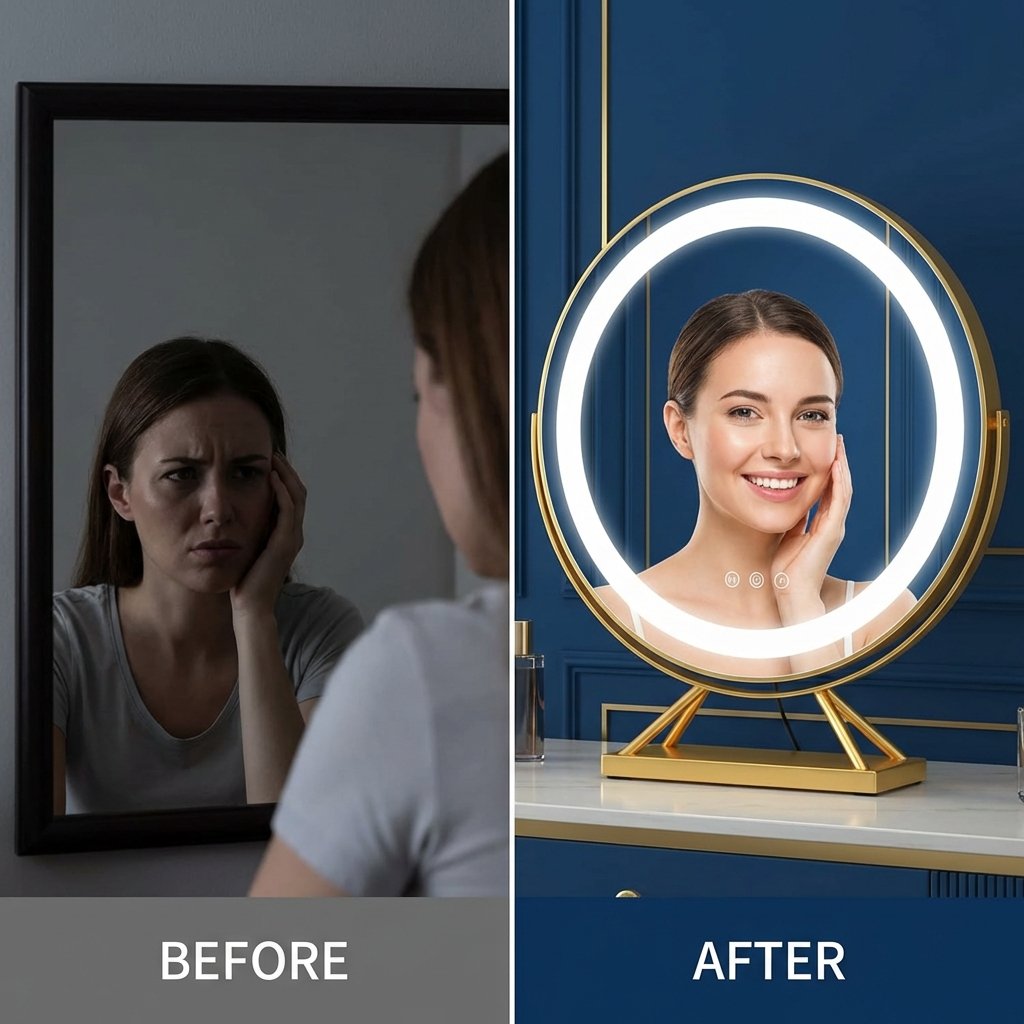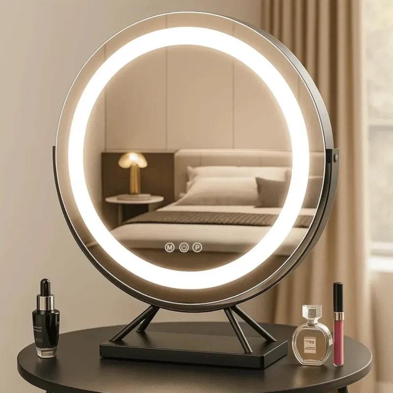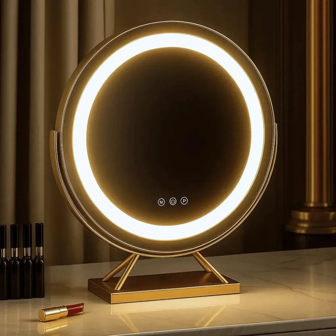 Achieve professional-grade results at home with the LED-Glow vanity mirror. Featuring three adjustable light modes (Warm, Daylight, Cool) and a smart touch-sensor dimmer, this mirror ensures your makeup is always flawless. The 360-degree rotation and sleek gold iron frame offer both style and function, making it the perfect centerpiece for your modern dressing table.