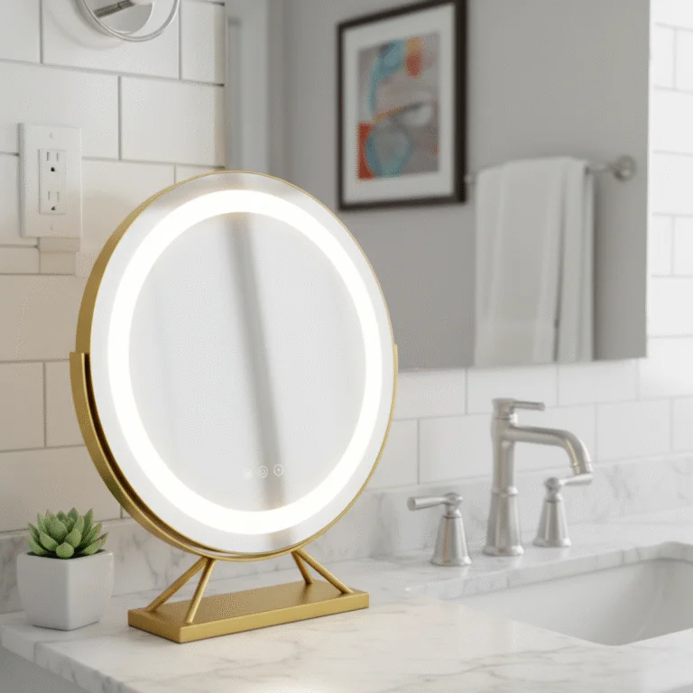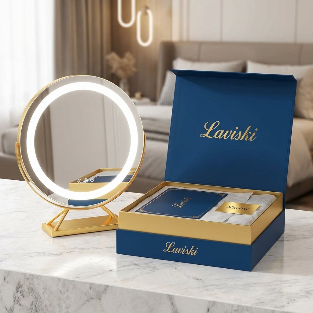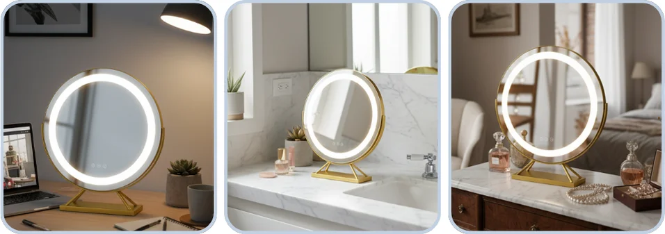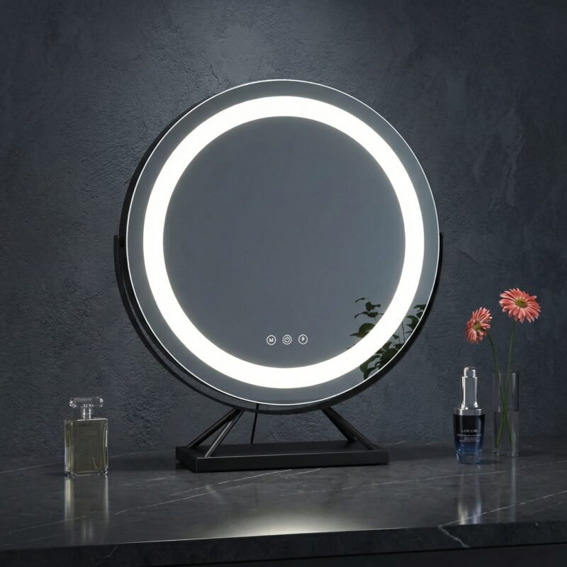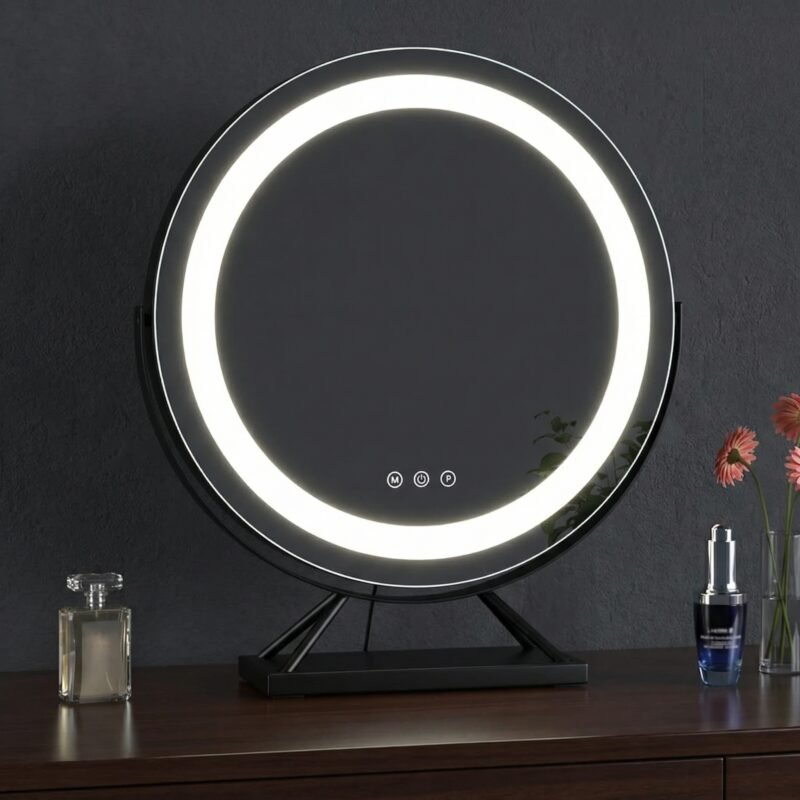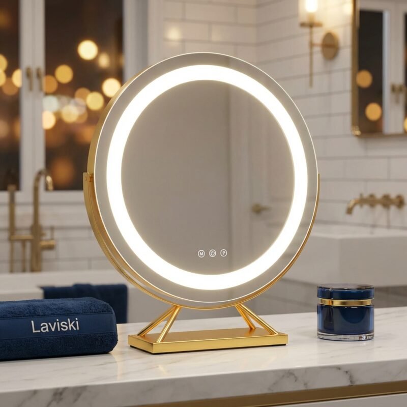 Achieve professional-grade results at home with the LED-Glow vanity mirror. Featuring three adjustable light modes (Warm, Daylight, Cool) and a smart touch-sensor dimmer, this mirror ensures your makeup is always flawless. The 360-degree rotation and sleek gold iron frame offer both style and function, making it the perfect centerpiece for your modern dressing table.