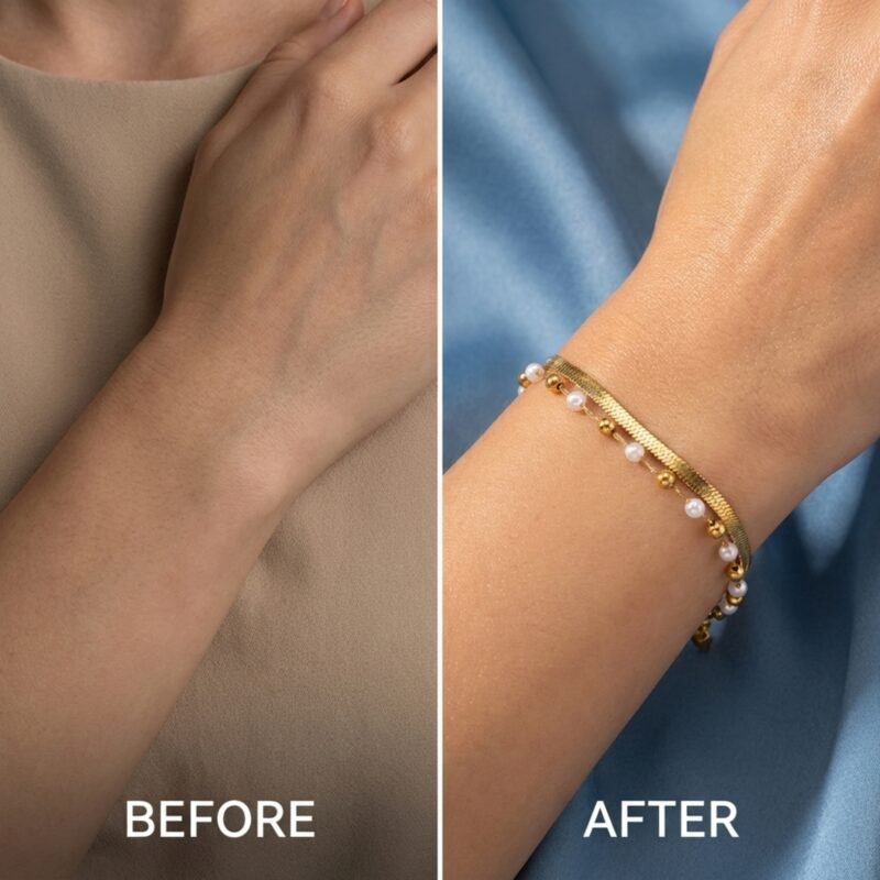 A: No. The Solara features premium stainless steel construction with 18K gold plating specifically designed to resist tarnishing, fading, and skin discoloration. The hypoallergenic materials are safe for sensitive skin and maintain their brilliant finish through regular wear.