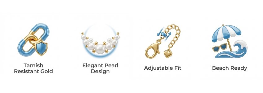 Transform your summer style with theΒ Solara Pearl Anklet, whereΒ timeless elegance meets modern durability. Crafted fromΒ premium stainless steel with 18K gold plating, this stunning ankle bracelet features delicate imitation pearls that catch the light beautifully. TheΒ tarnish-resistant constructionΒ ensures your anklet maintains its radiant golden glow through countless beach days, pool parties, and sunset strolls.Β Adjustable sizing (8-11 inches)Β guarantees a perfect, comfortable fit.