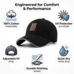 The Vantex Premium Cotton Baseball Cap delivers superior comfort and protection for the active man. Crafted from 100% breathable cotton, this cap features UV sun protection technology to shield your skin during outdoor adventures. The adjustable metal clasp ensures a perfect fit, while the contrast trim adds a modern touch to this classic design.