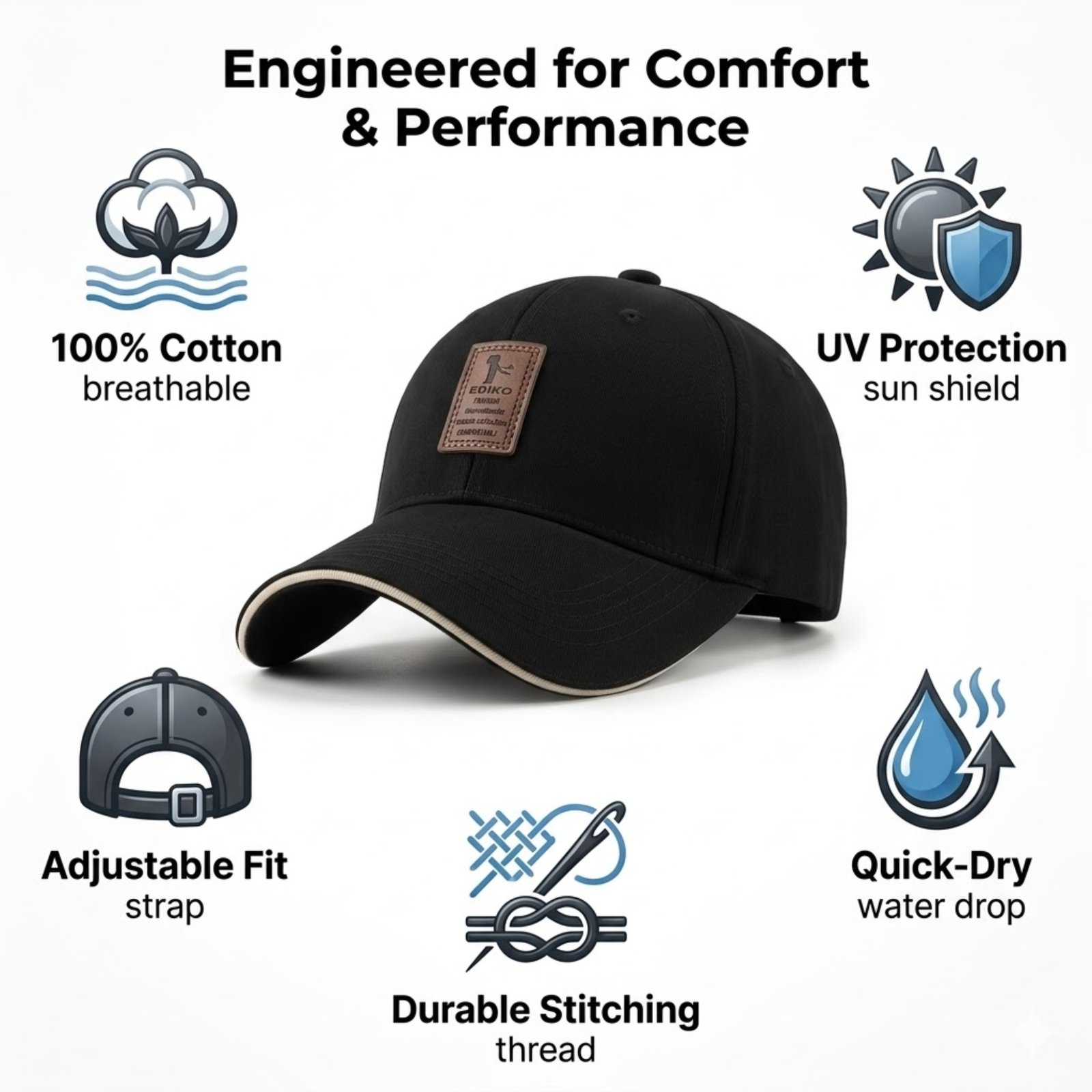 Built for durability with reinforced stitching and a structured crown that maintains its shape, this quick-dry baseball cap transitions seamlessly from morning runs to weekend outings. The premium leather patch branding adds sophistication. Available in versatile colors: black, khaki, and navy blue, each cap complements any wardrobe while delivering all-day comfort and reliable sun protection.