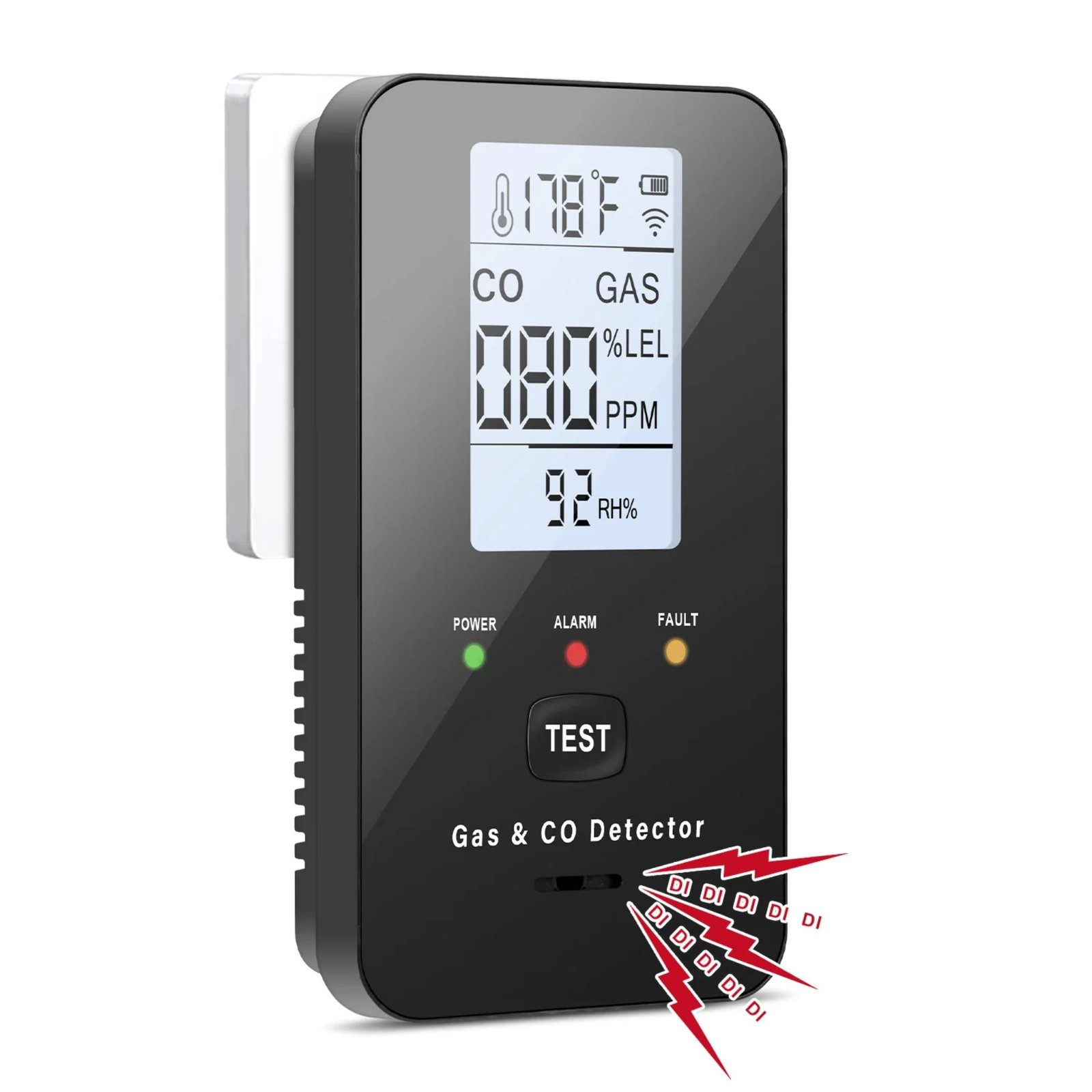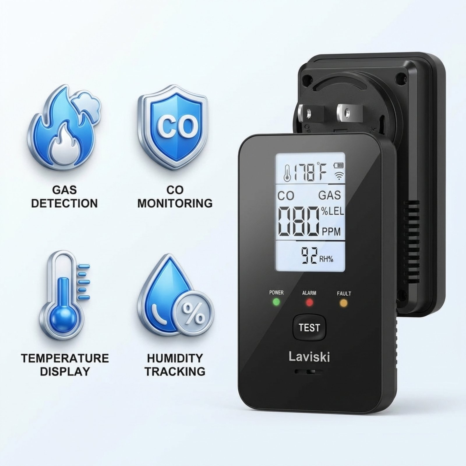- Features: 4-in-1 Electrochemical sensor, LCD backlit display, 85dB alarm, Manual Test button.
