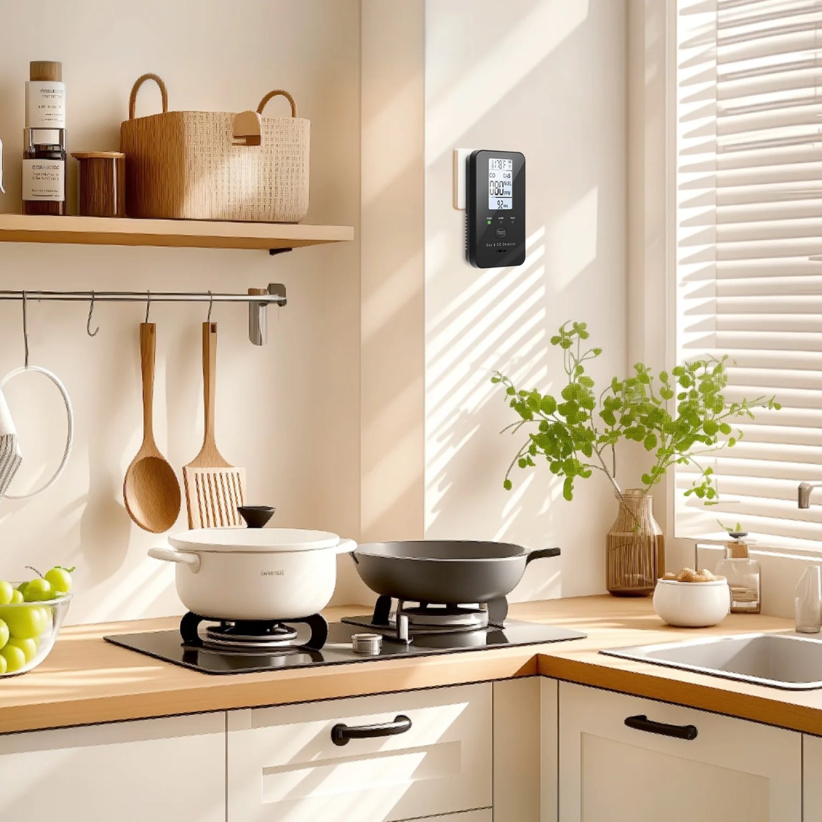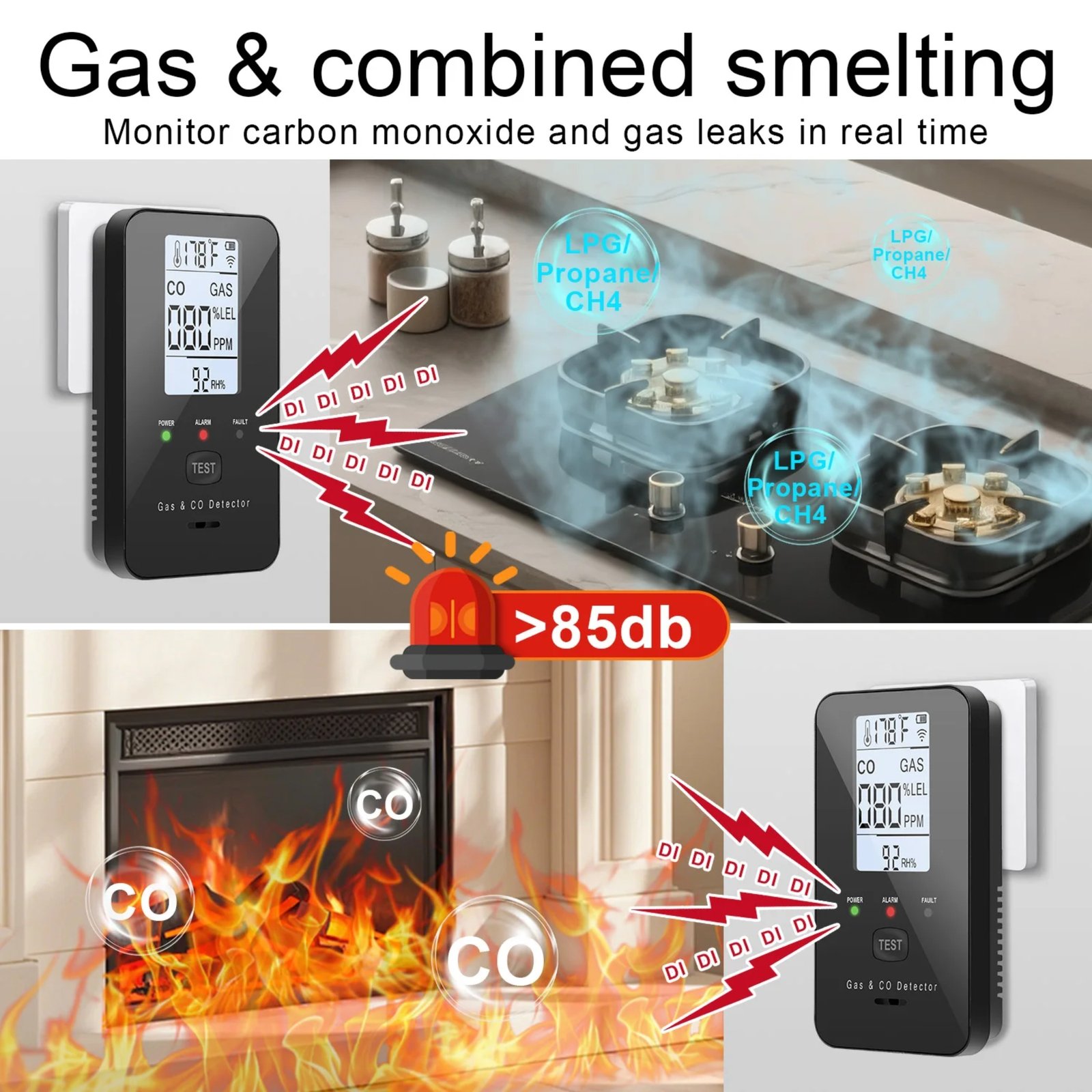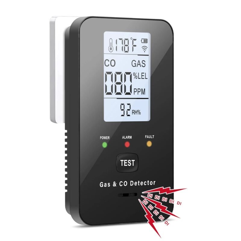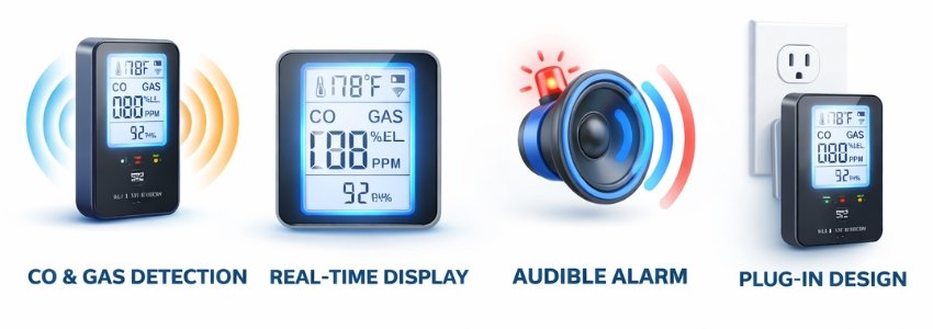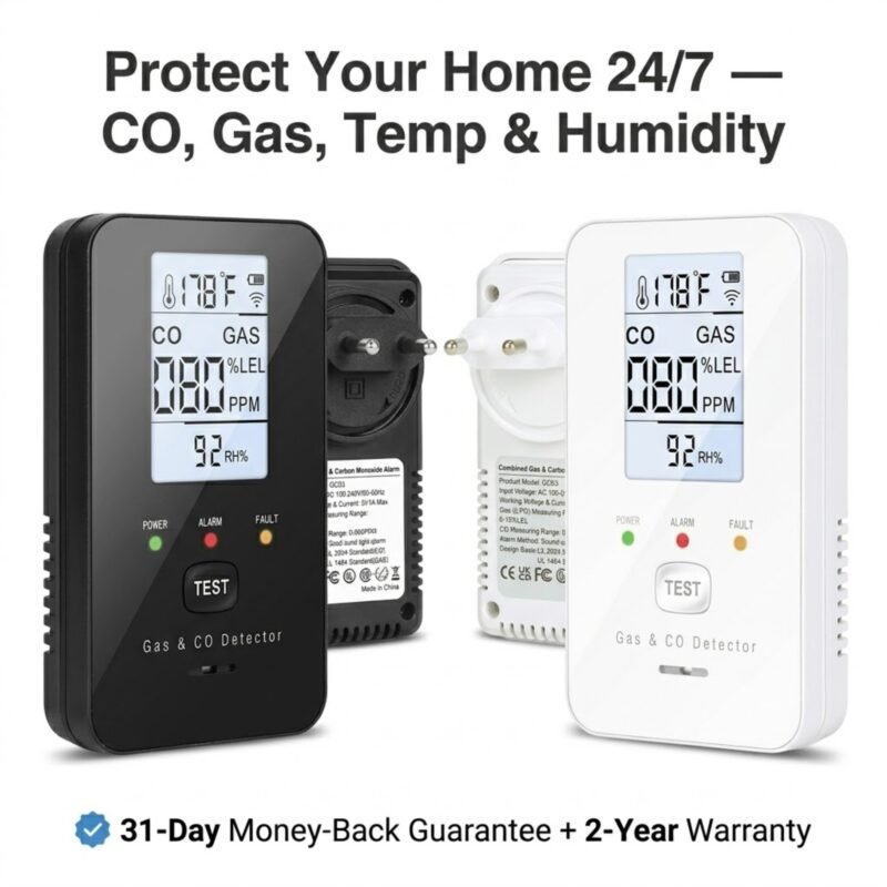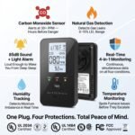 - 4-in-1 Monitoring: Tracks CO, Gas, Temperature, and Humidity simultaneously for full safety.