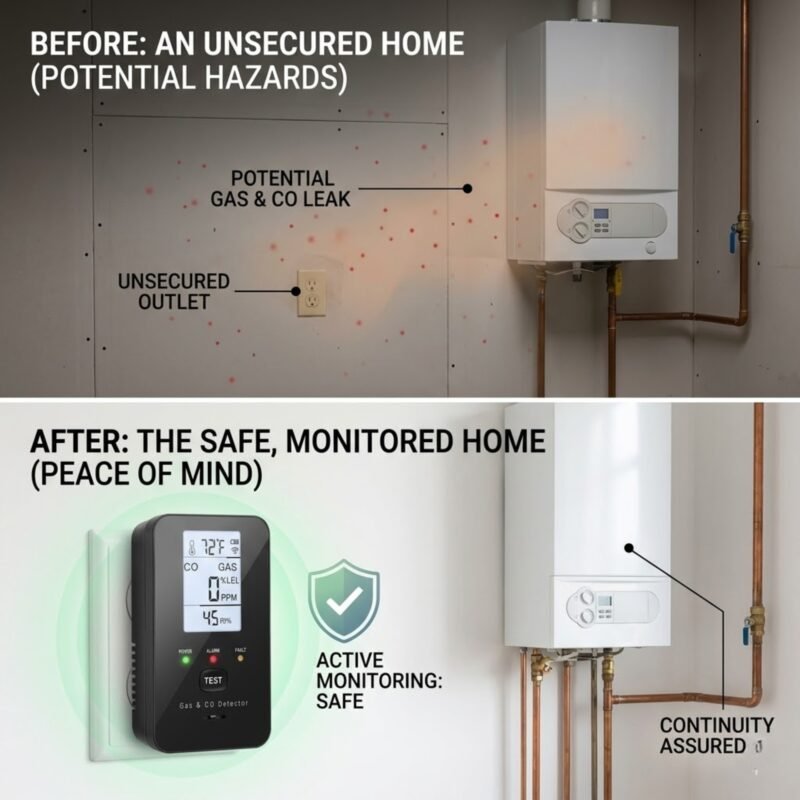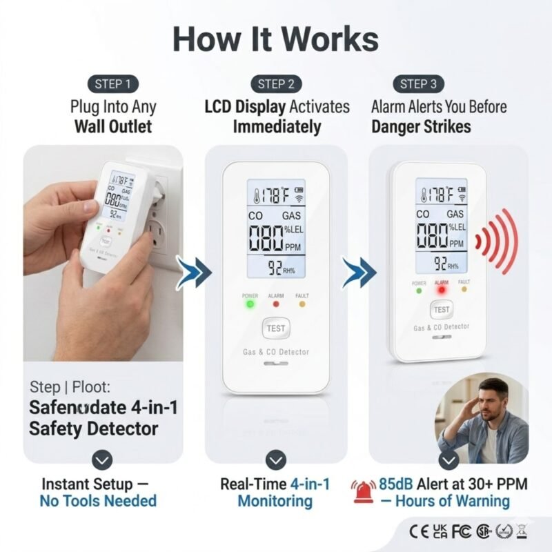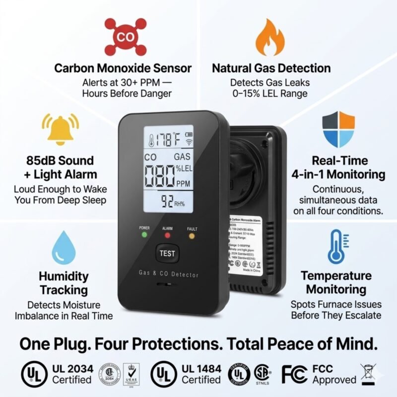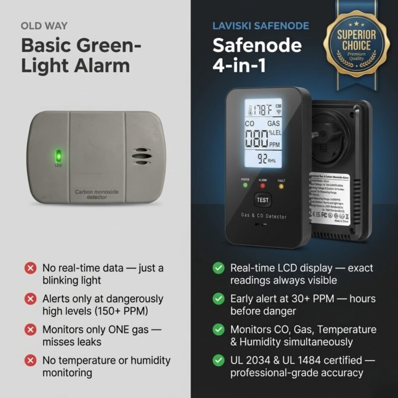 Stop worrying about the silent killers in your home. The Safenode 4-in-1 Detector provides professional-grade protection by monitoring Carbon Monoxide and Natural Gas in real-time. Unlike standard alarms, it alerts you at 30+ PPM, giving you hours to evacuate before danger strikes. This UL-compliant device ensures your family stays safe and protected 24/7.