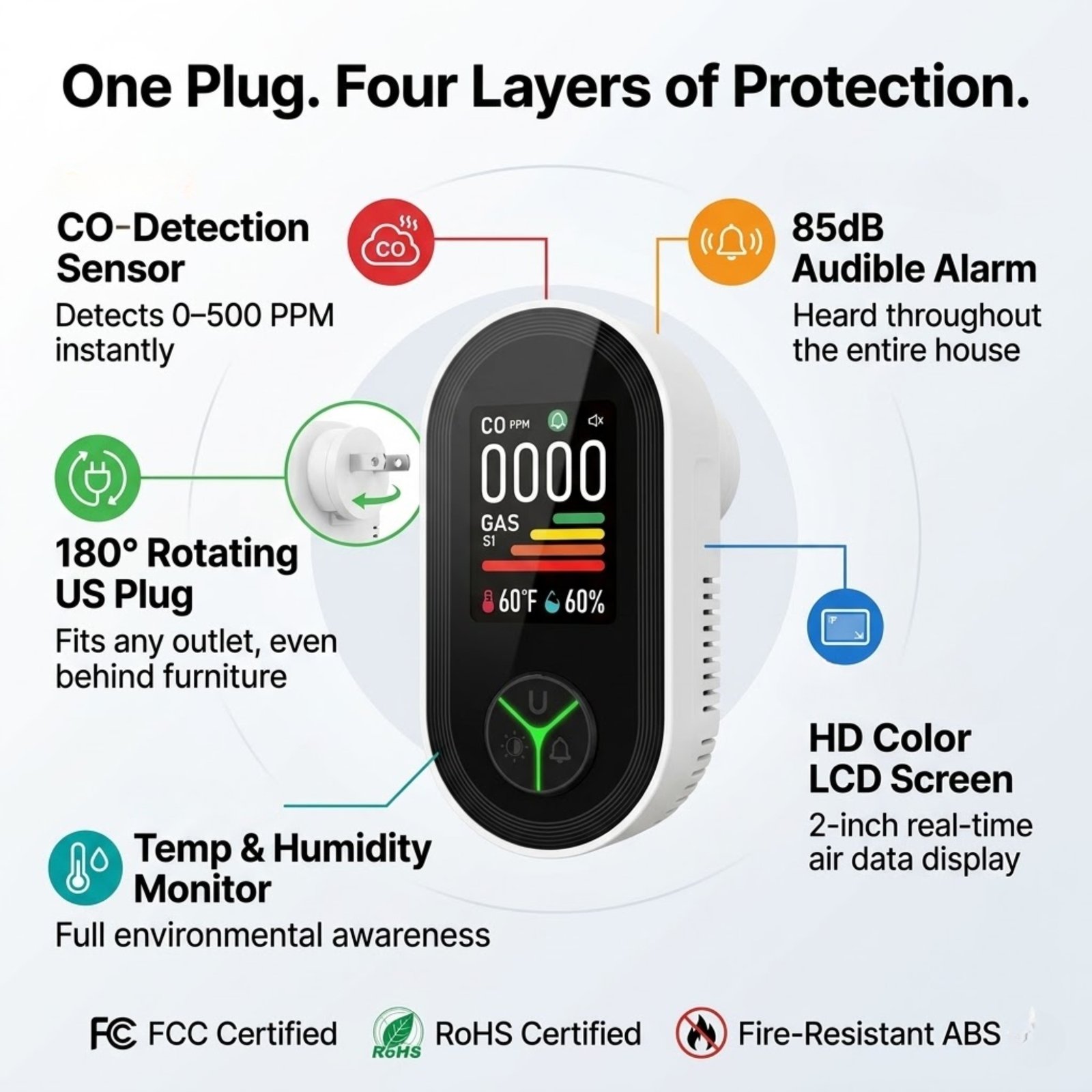 - 24/7 Real-Time Monitoring: High-precision sensors detect CO leaks instantly for round-the-clock safety.