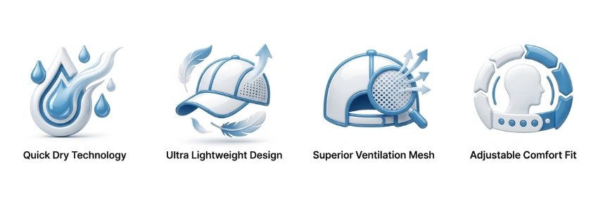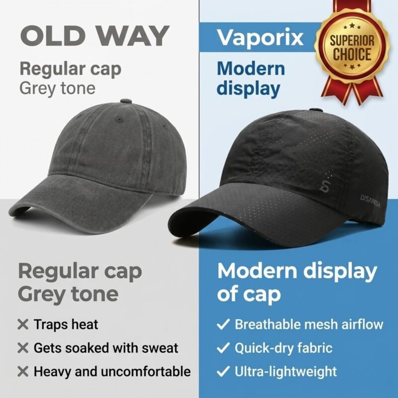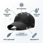 A: Absolutely! The Vaporix features perforated mesh ventilation panels throughout the entire cap, creating continuous airflow that regular solid-fabric caps can’t match. The quick-dry polyester actively wicks moisture away from your skin, preventing the damp, heavy feeling you get with standard caps.