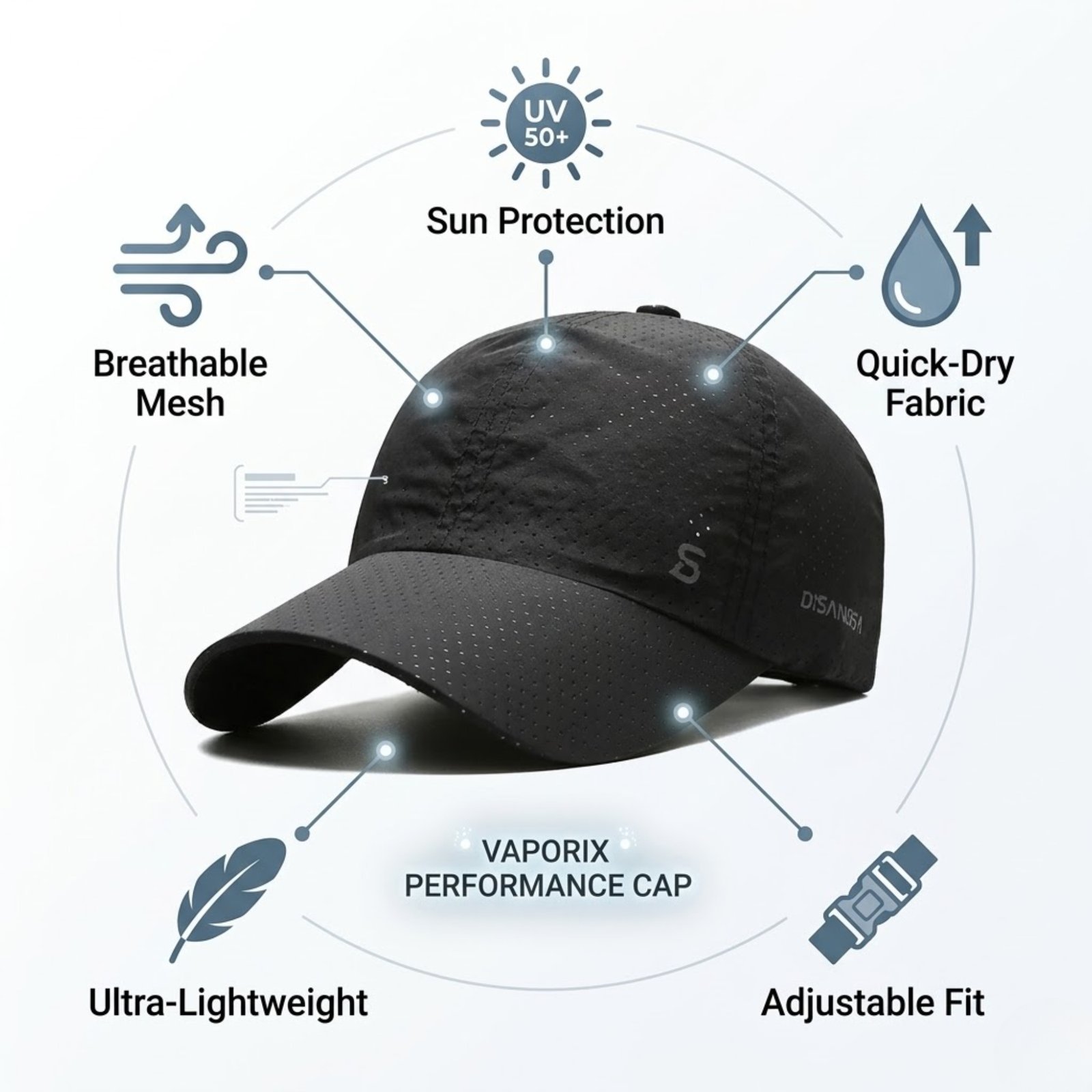 The Vaporix Breathable Performance Cap is engineered for active individuals who refuse to let heat slow them down. Featuring advanced perforated mesh ventilation and quick-dry polyester fabric, this cap pulls moisture away from your skin instantly. Whether you’re running a 10K, fishing at the lake, or working outdoors, you’ll stay cool and focused. The ultra-lightweight construction ensures you’ll barely feel it on your head, while the adjustable strap provides a custom fit that stays secure during intense activity.