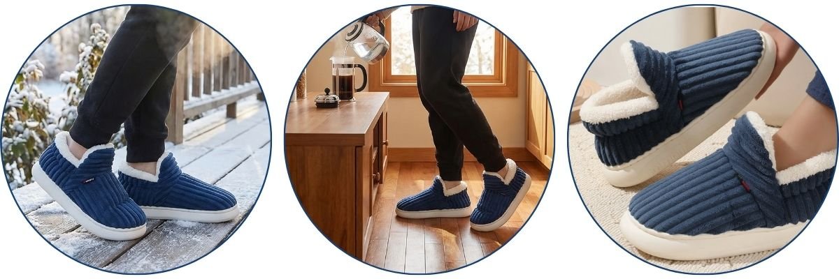 Experience ultimate comfort with thermal fleece house slippers that combine warmth and versatility.Β Soft ribbed corduroy exteriorΒ adds texture and style while theΒ thick plush fleece liningΒ wraps your feet in cozy warmth. Ankle-height design provides extra coverage to lock in heat during cold winter months. TheΒ slip-on designΒ allows quick and easy wear for instant comfort.