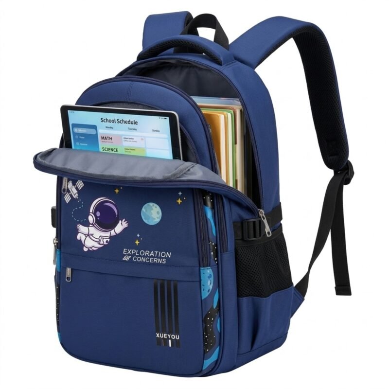 A: The main compartment easily fits multiple textbooks, notebooks, and a 13-inch tablet or laptop. Additional pockets accommodate lunch boxes, water bottles, pencil cases, and personal items—everything needed for a full school day.